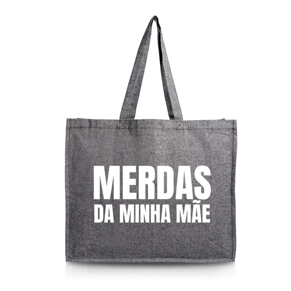 ESGOTADO TEMPORARIAMENTE – Saco grande “As merdas da minha Mãe” (saco preto c/ letras brancas toque veludo) – 100% algodão reciclado 190g/m²